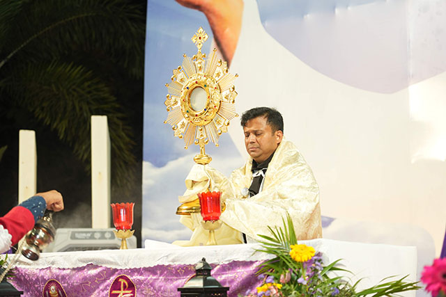 The spiritual programme commenced with the recitation of the Holy Rosary, followed by an uplifting session of praise and worship led by Br Rony D'Souza and his team. The highlight of the evening was the solemn holy Eucharistic celebration, presided over by Fr James D’Souza, parish priest of Vamanjoor and vicar Forane of the city deanery. During the liturgy and the intercessory prayers, special emphasis was placed on the youth, invoking divine guidance, strength, and spiritual empowerment for the younger generation of the diocese.