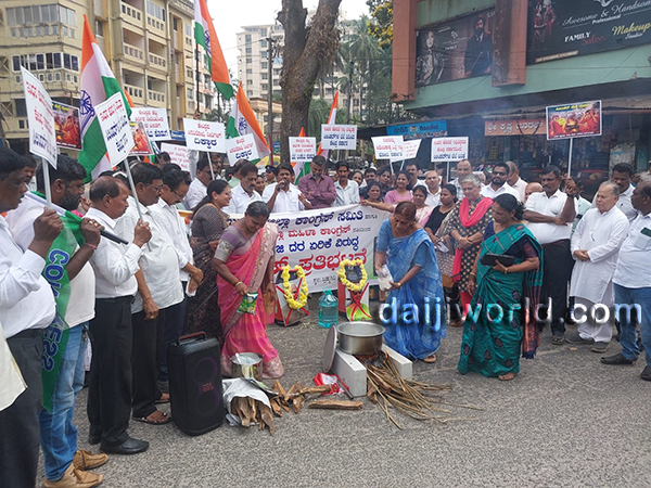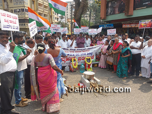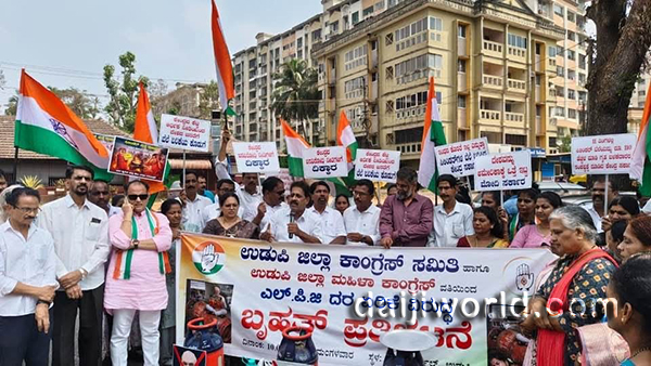 Congress leaders and members took out a protest march from the Udupi District Congress office to Brahmagiri Circle, where they held a demonstration. During the protest, Mahila Congress members lit a firewood stove on the road and prepared tea, which was distributed to the public as a symbolic gesture.