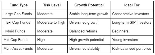 Large cap funds offer stability, flexi cap funds provide diversification, hybrid funds balance risk, mid cap funds deliver growth potential, and multi-asset funds create diversified portfolios. By combining these categories thoughtfully, investors can build a well-balanced SIP strategy that suits their financial goals.