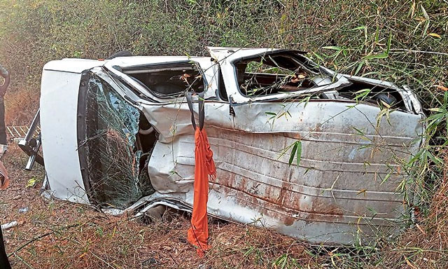 The mishap occurred when an Eeco car travelling from Dharmasthala towards Kukke Subrahmanya went out of control and overturned into a roadside drain.