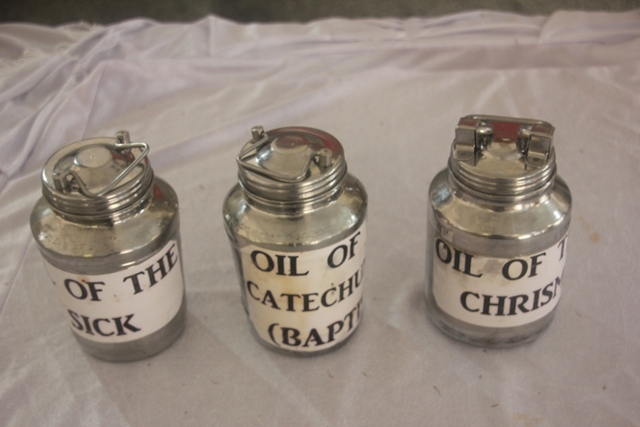The Holy Chrism (“Sanctum Chrisma”) or “Oil of Gladness,” which is olive oil mixed with a small amount of balm or balsam. It is used in Confirmation, Baptism, in the consecration of a Bishop, the consecration of various things such as churches, chalices, patens, and bells.