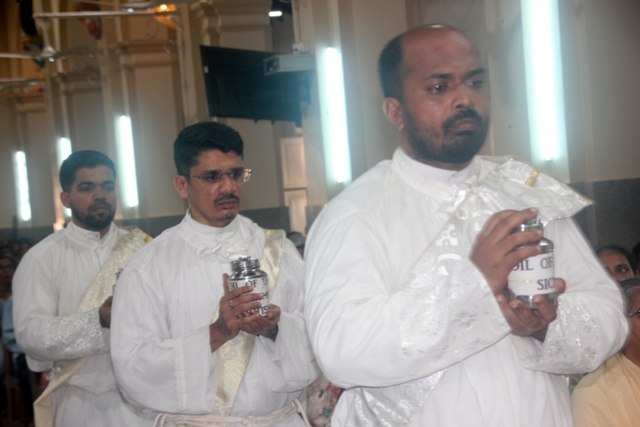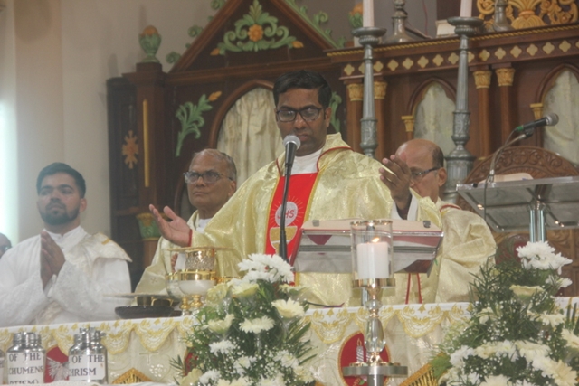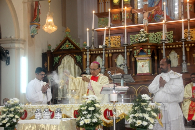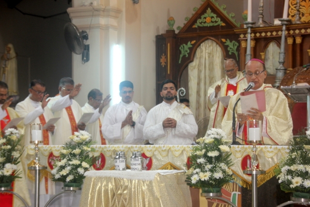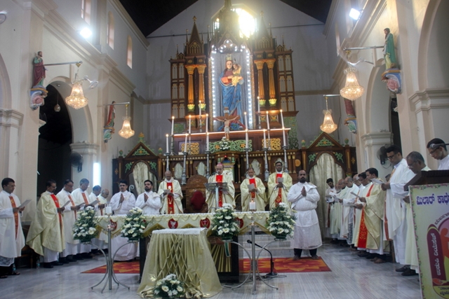 The solemn Chrism mass was celebrated by administrator of the Udupi Diocese, Bishop Most Rev Dr. Gerald Isaac Lobo along with designated Bishop of Udupi diocese Very Rev. Msgr. Dr. Leslie Clifford D’Souza, Very Rev Msgr Ferdinand Gonsalves, Rector of the Cathedral, Very Rev Fr. Steeven D’Souza, Chancellor of the diocese, Very Rev Fr. Dr. Roshan D’Souza, Judicial Vicar of the diocese, Deans of deaneries of the diocese, diocese priests and religious priests of the diocese.