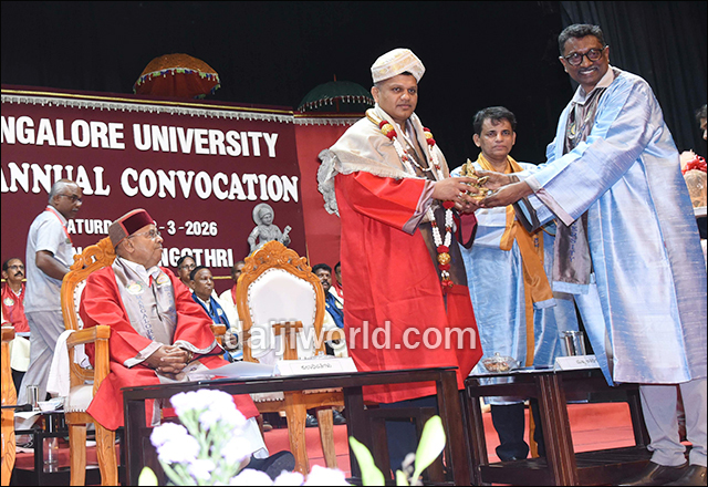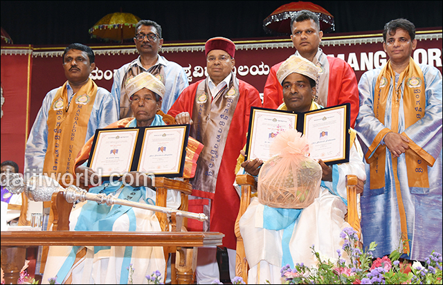 The ceremony was presided over by Thawar Chand Gehlot, Governor of Karnataka and chancellor of the university, who conferred honorary doctorates on Harekala Hajabba, popularly known as ‘Akshara Santa’, and Ravish Padumale.
