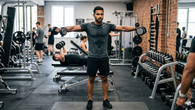 This exercise targets the side delts and helps create broader shoulders. Lift dumbbells out to the sides up to shoulder height with control, then lower slowly. Do 3–4 sets of 12–15 reps. It enhances shoulder width and stability.