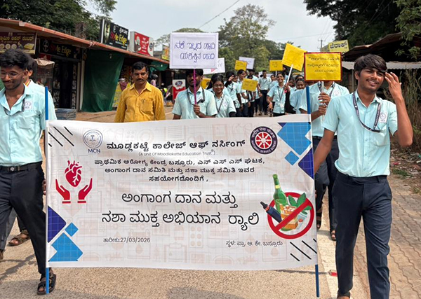 Kundapur, Mar 31: An awareness rally on organ donation and drug de-addiction was organized on Friday by the NSS unit of Moodlakatte College of Nursing, in association with the Organ Donation and Anti-Drug Campaign Committees.
