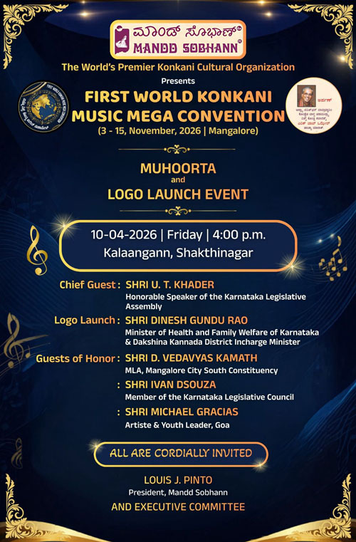 Mangaluru, Apr 8: Mandd Sobhann, one of the world’s premier Konkani cultural organizations, will host the muhurtham and logo launch of the First World Konkani Music Mega Convention on Friday, April 10, at 4:00 pm at Kalaangann.
