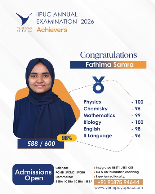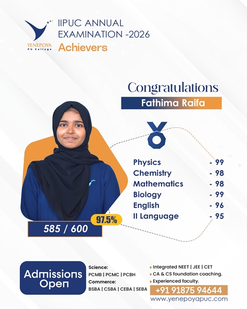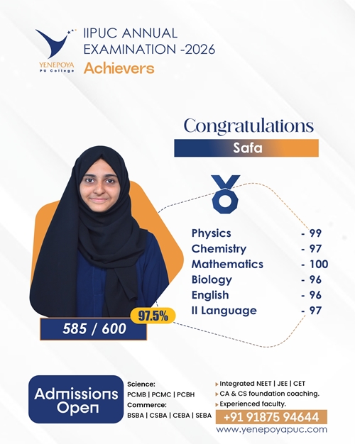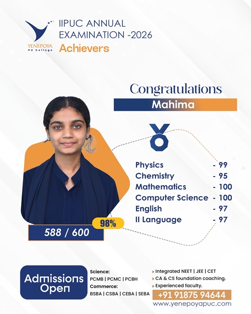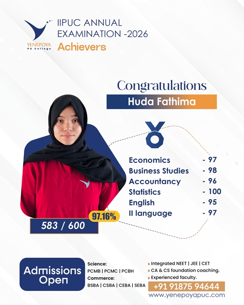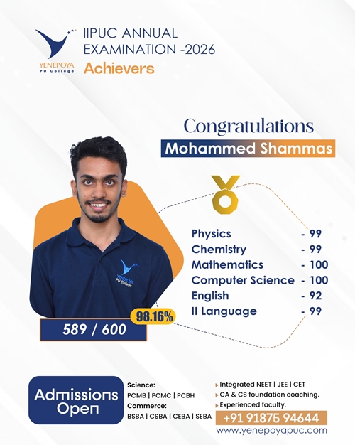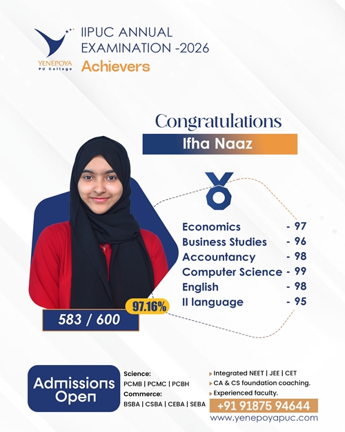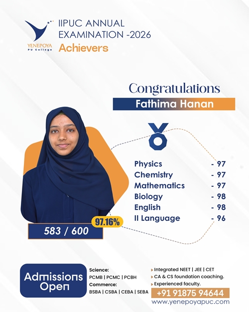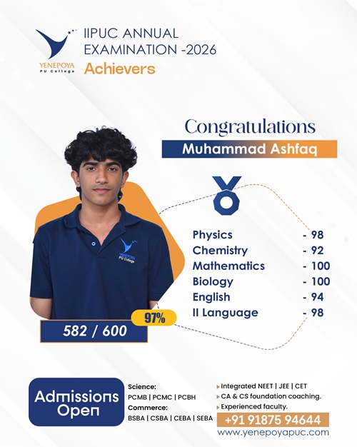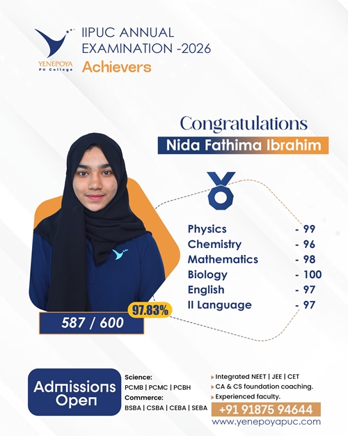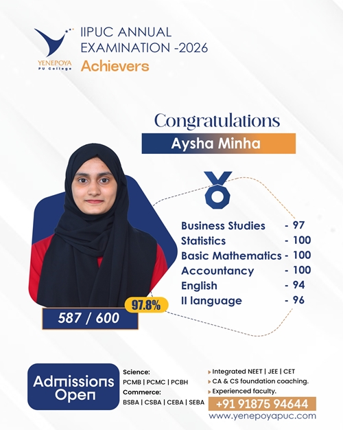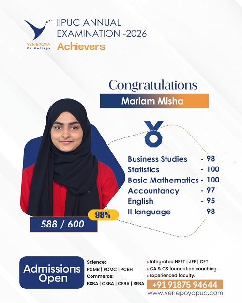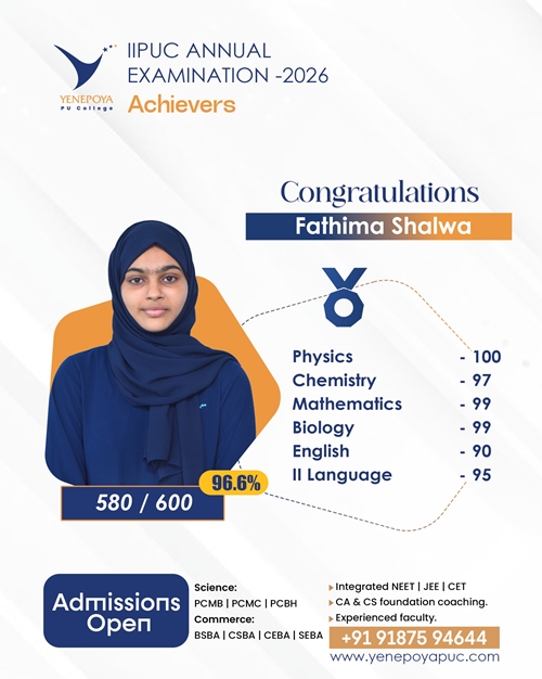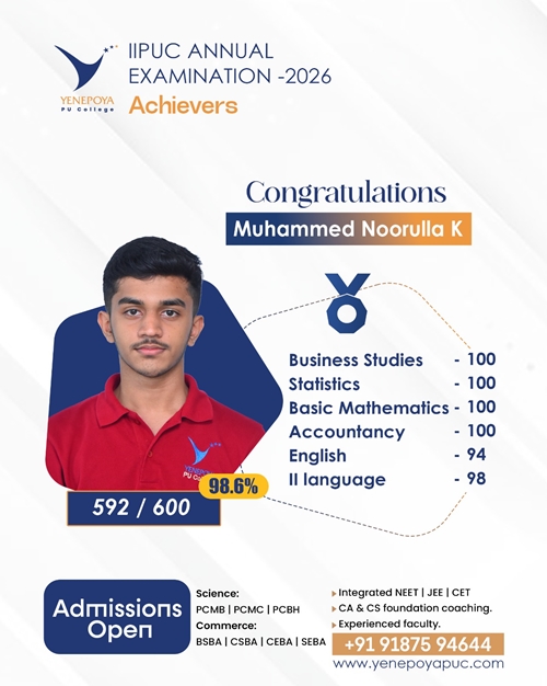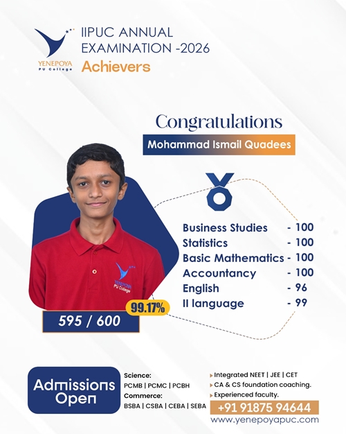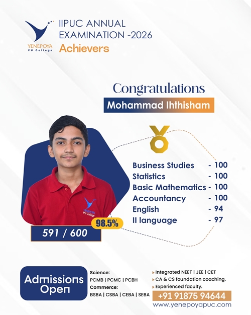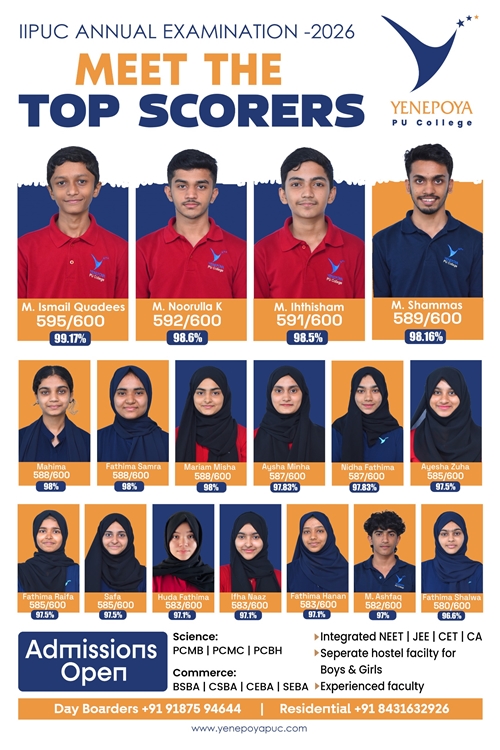Mangaluru, Apr 10: Yenepoya PU College has once again set a remarkable benchmark in academic excellence in the IIPUC Annual Examination 2026, with students delivering exceptional results and securing state 4th, 7th, 8th, and 10th ranks.