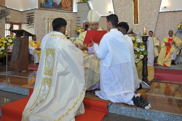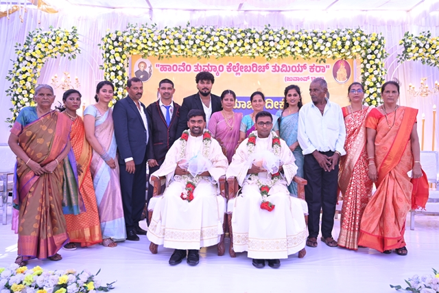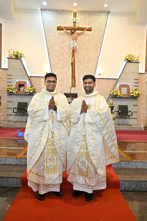 Bantwal, Apr 14: On Tuesday, April 14, the Our Lady of Vailankanni Church in Farla was the site of a joyous ordination ceremony, where two Pallottine deacons - Nickson Joyson D'Souza from Farla Parish and Santhosh D'Almeida from Narampadi Parish were ordained as priests by Dr Peter Paul Saldanha, Bishop of Mangalore.