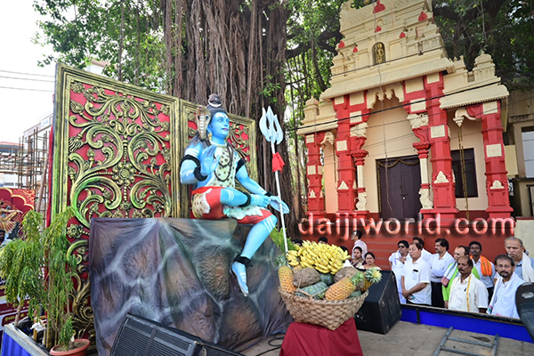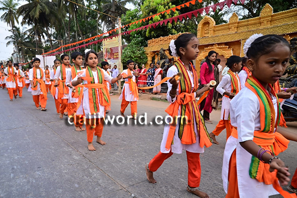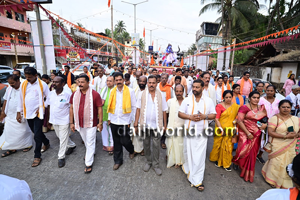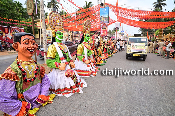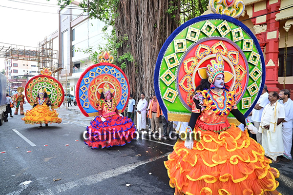 The procession witnessed enthusiastic participation from devotees, especially women carrying traditional offerings adorned with decorative titles. A massive Shiva Linga replica, chende and band performances, bhajans, and cultural attractions such as Keelu Kudure dance, Yakshagana costume dolls, and various tableaus added to the grandeur.