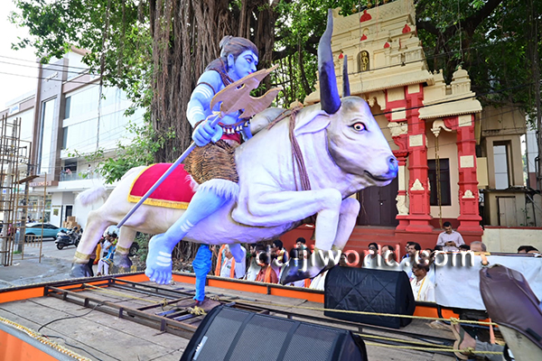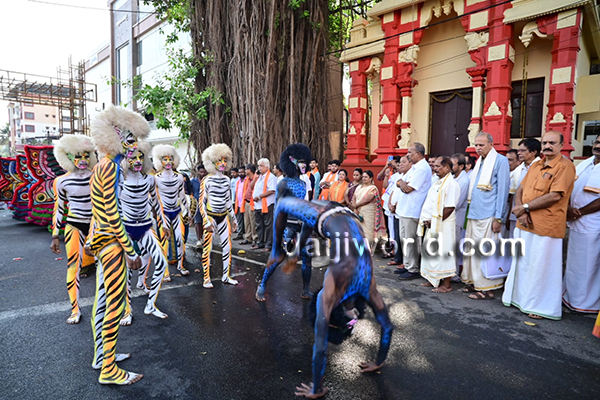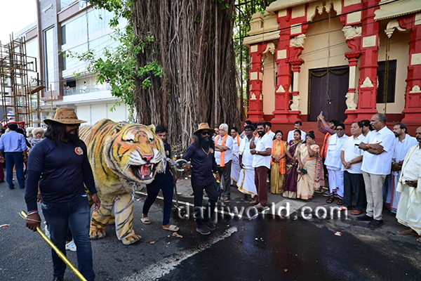 Special attractions included portrayals inspired by popular movie characters like Karunakara Guruji, Bhava and Ravianna, along with tiger dance performances, a giant tiger figure, Hanuman costume, and a striking tableau depicting Lord Shiva seated on Nandi, captivating the large gathering of spectators.