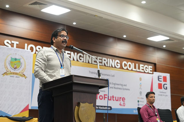 The valedictory programme commenced with a video presentation highlighting key moments from HackToFuture 4.0, followed by an invocation by the college choir. The dignitaries were escorted to the dais by the faculty convenors. Dr Melwyn D’Souza, head of the department of computer science and engineering, welcomed the gathering and presented an overview of the HTF 4.0 statistics.
