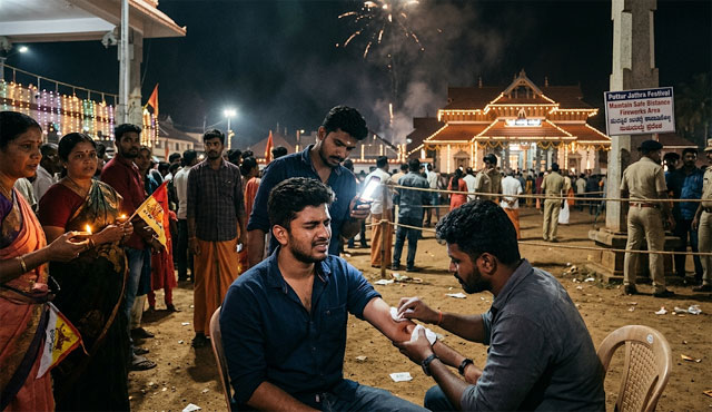 Title: Puttur: Seven injured as sparks from fireworks display fly into crowd at fair