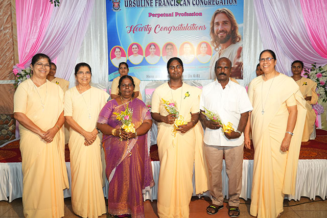 The felicitation programme began with a greeting song by the choir. Sr Milly Fernandes felicitated the sisters along with their parents, expressing gratitude for their generous offering to the Ursuline Franciscan family. In her address, she encouraged the sisters to live their vocation with single-minded devotion and to remain steadfast against the fleeting attractions of the world.
