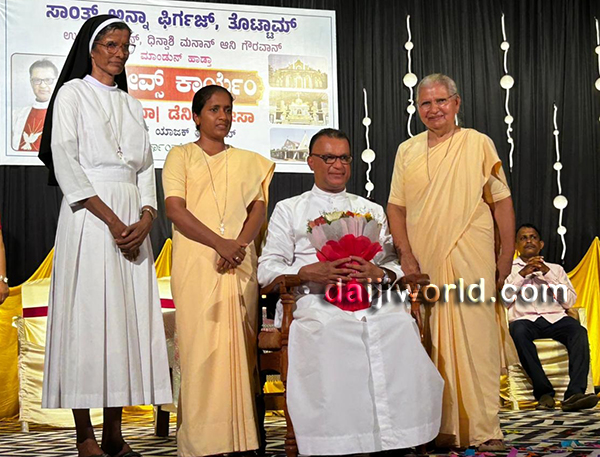 Udupi, Apr 27: A heartfelt farewell was accorded to Fr Denis D’Sa, who has been transferred as the parish priest of Our Lady of Sorrows Church, Udupi from St Ann’s Church, Thottam, after serving the parish for four years. The programme, held at ST Ann’s Church, Thottam on Sunday, April 26 witnessed participation from members of various faiths, reflecting the strong communal harmony fostered during his tenure.