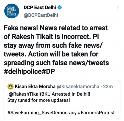 The Delhi Police also denied the rumours of Tikait's alleged arrest, saying, "This news is completely false and action will be taken against those spreading such rumours."