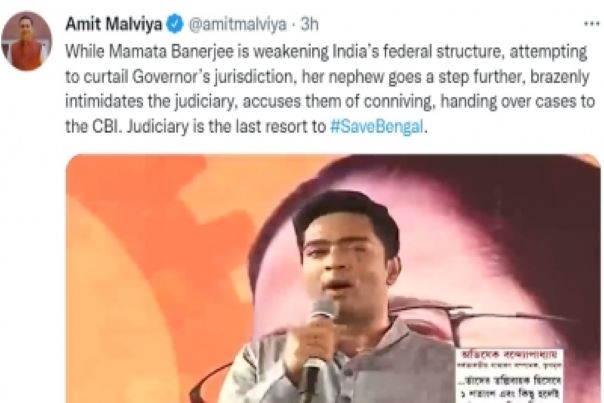 West Bengal BJP co-incharge Amit Malviya tweeted, "While Mamata Banerjee is weakening India's federal structure, attempting to curtail Governor's jurisdiction, her nephew goes a step further, brazenly intimidates the judiciary, accuses them of conniving, handing over cases to the CBI. Judiciary is the last resort to #SaveBengal."