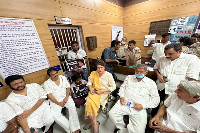 New Delhi, Jun 13 (IANS): Congress leader Priyanka Gandhi Vadra met with the party leaders who were detained by the Delhi Police and kept at Tughlak Road police station on Monday.