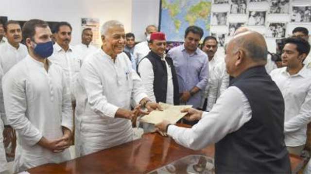 Congress leader Rahul Gandhi, NCP chief Sharad Pawar, Samajwadi Party chief Akhilesh Yadav, National Conference chief Farooq Abdullah, CPI-M leader Sitaram Yechury and other opposition leaders were present at the filing of Sinha's nomination.