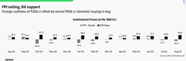 Domestic Institutional Investors (DIIs) comprise majorly of the Mutual Fund (MF) industry, Insurance companies, local pension funds, Banks and other institutions that invest in Indian equities. The collective inflows from the DIIs have been Rs 5.30 Lakh Crores in CY 2025 and the share of the MF industry has been close to 70% at Rs 3.65 Lakh Crores. The MF net inflows in the month of August’25 has been Rs 33,430 Crores, where the Systematic Investment plan (SIPs) has been at a steady Rs 28,265 Crores. The SIP book as it is referred to suggests that if the Mutual Fund Industry in India decides to go to sleep, the inflows of Rs 20,000 Crores+ will still continue pouring month on month. So, what is keeping the Indian equity markets buoyant in the current season is the new found liquidity in the form of DIIs.