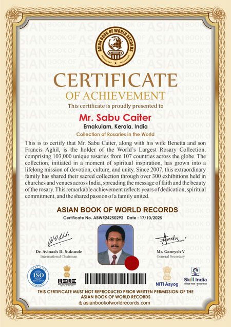 This remarkable achievement reflects years of dedication, spiritual commitment, and the shared passion of a family united. Asia Book of world record. This is to proudly certify that Sabu Kaiter, born in Kochi, Kerala, has achieved a remarkable and spiritually significant milestone at the age of 59 year by being recognized for maintaining the Largest Rosary Collection (103000 Rosaries). This extraordinary collection stands as a symbol of deep faith, devotion, and a lifelong commitment to preserving spiritual heritage.