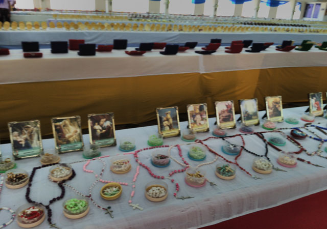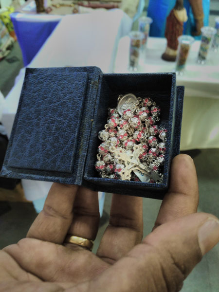 Rarest of the Rare: The exhibition carries at least 15,000 certified rosaries. There are also Holy Rosaries from Jerusalem, Bethlehem, Fatima and Lourdes. Rosaries made out of rubber, wax, stone, Crosses, one of Rudraksha' exclusive Indian origin. Many impressed recorded their comments in the visitor's books kept at the venue. The visitors were made up from all walks of life, of all ages, even a few elderly in wheel chairs were seen. Each rosary is different in colour, size, design, material and other things. Some were special from the point of their antique value; there are 800 such old rosaries. Three hundred are from Vatican City alone, most are Italian made.