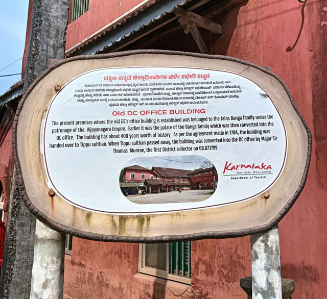 Known as the Collector’s Office (1799-1950), this monument housed the British administrative hub for South Kanara (Dakshina Kannada, Udupi, and Kasargod districts) of British Madras Presidency. Even after Independence, the deputy commissioners or Collectors (DC) operated from this historic base. The tourist plaque at the gate reads "OLD DC OFFICE BUILDING : The present premises of the old DC's (District Collector's) office building belonged to the ruling Jain Banga family under the patronage of the Vijayanagara Empire. It was the palace of the Banga Rulers. Converted to the Administrative office of the British in the region. The building has more than 400 years of history. Prior to the 1780s it was in possession of the Mysore rulers of whom Tipu Sultan was the last. When the British conquered Tipu's lands in 1799 it came into the possession of the British Administration headed by Major Sir Thomas Munroe, the first British Collector on July 8, 1799."
