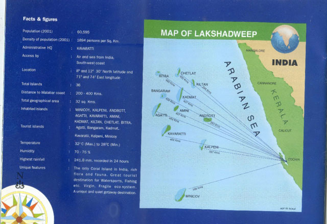 Exceptionally, the Southernmost Island of present Lakshadweep islands is Minicoy. This Minicoy Island, in all its features is practically a part of the Maldives group, the inhabitants speak, Mahal - a primitive form of singalese, and write in the Dhivehi script, dress and culture too are similar to the Maldives. It came into Indian possession from British Ceylon (now Sri Lanka) in 1956, and for some time thereafter too political uncertainty was experienced. Mangalore used to serve as the seat of administration for the islands pre 1950s. The headquarters of the UT of Lakshadweep is the Island of Kavaratti. In recent times much is planned to promote tourism and develop it into another great ecology and leisure spot. One can travel to the Islands after obtaining permission from the Lakshadweep Administrator's office now at Kochi, by Ship or plane. Indian services provide services as per schedule. In the Lakshadweep, the one airstrip at Agatti Island, some airlines have scheduled flights connecting Chennai/Bangalore, Kochi - others too can be expected to be included soon. From Agatti, inter island speed boat and helicopter services are available selectively. The mainland/island ship services have basic facilities for short travel. (Please refer to www.lakshadweep.nic for relevant detailed information). In the near future great changes are forecast by weather scientists, detrimental to the coral formations in the Arabian Sea, which could gradually submerge the islands. The main hazard causing this is the Global warming phenomena which needs care and attention from all people around the world.