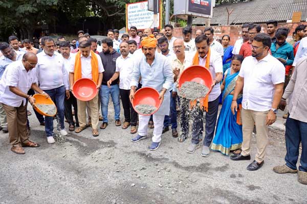 ರಸ್ತೆ ಗುಂಡಿಗೆ ಆಕ್ಷೇಪ- ಬಿಜೆಪಿ ಸಂಚಾರ ತಡೆ ಚಳವಳಿ