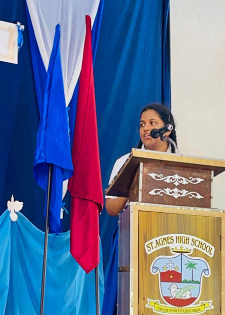 Mangaluru, Jun 21: The investiture ceremony of St Agnes High School was held on June 19. The ceremony commenced with a march past by the members of the school parliament. This was followed by a meaningful prayer service, invoking blessings for the leaders as they stepped into their new roles. Kadhijah welcomed the guest and the hosts. As a gesture of appreciation and environmental consciousness, the Headmistress extended a warm welcome to the chief guest, Dr Professor Devi Prabha, by presenting her with potted plants.