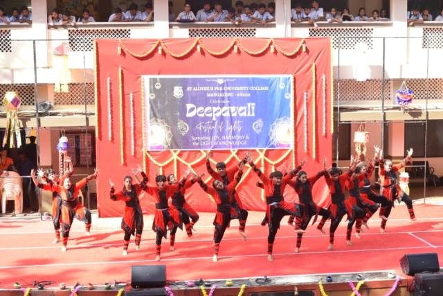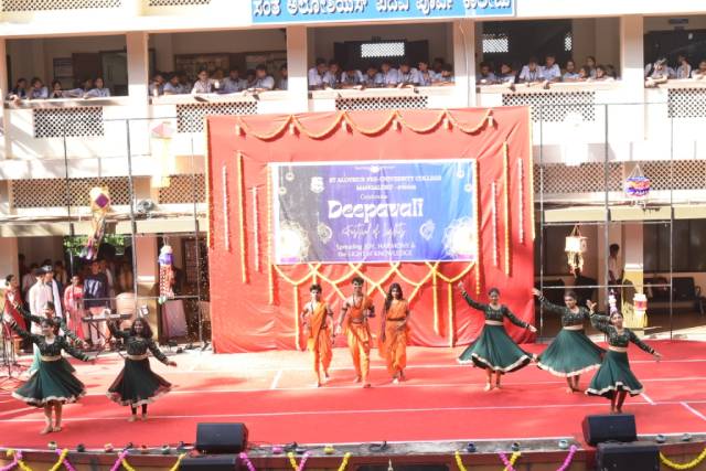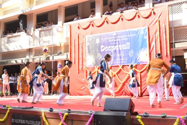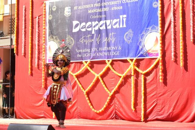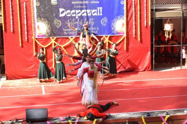 Deepavali celebrates the homecoming of Lord Rama and destruction of the demon Narakasura in the hands of Lord Krishna. The vibrant cultural performances presented by students, including a Kunithabajane, dance drama, Yakshagana and dances reflected the joy of these occasions.
