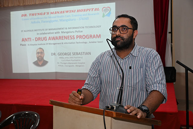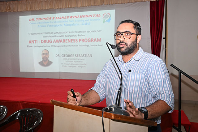 Mangaluru, Oct 29: A drug abuse awareness programme was held at St Aloysius Institute of Management & Information Technology (AIMIT), Kotekar Beeri, in collaboration with Dr Thunga’s Manaswini Hospital, Arkula, and the Mangaluru police department, to sensitize students on the dangers of substance abuse and promote mental well-being.