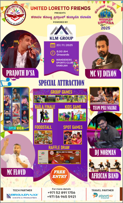 Continuing its mission to bring people together, United Loretto Friends Dubai proudly announces its upcoming Mega Festival – Konkan Udkana 2025, scheduled to be held on November 23, at Sharjah Wanderers Sports Club from 8 am onwards.