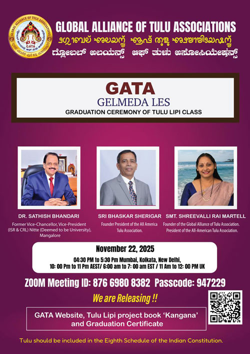 Florida (USA), Nov 27: The Global Alliance of Tulu Association (GATA) celebrated the closing of its Tulu lipi course, ‘Gelmeda Les’, on November 22, marked by the launch of its official website www.globaltuluva.com. The website offers Tulu learning tools, transliteration features, cultural resources, dictionaries, and a global platform for the Tuluva community.