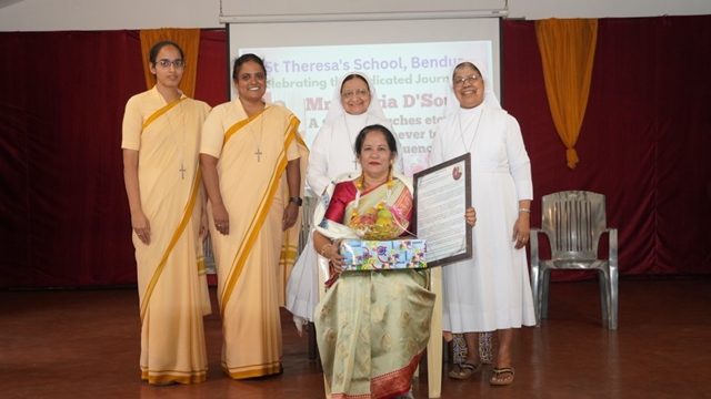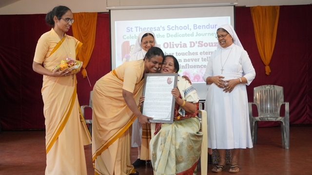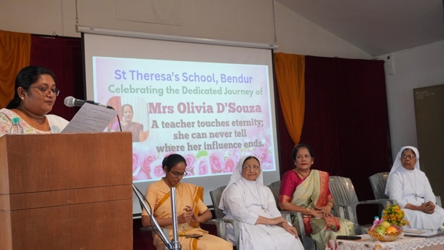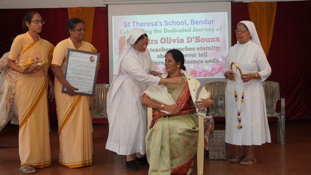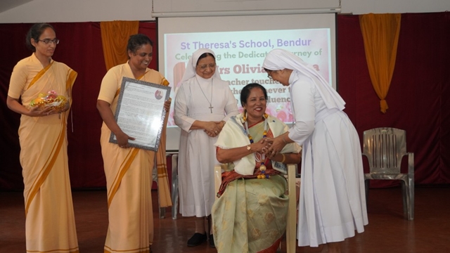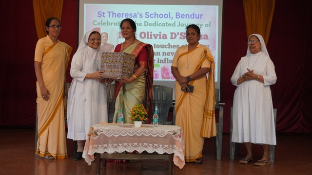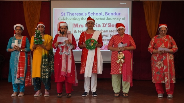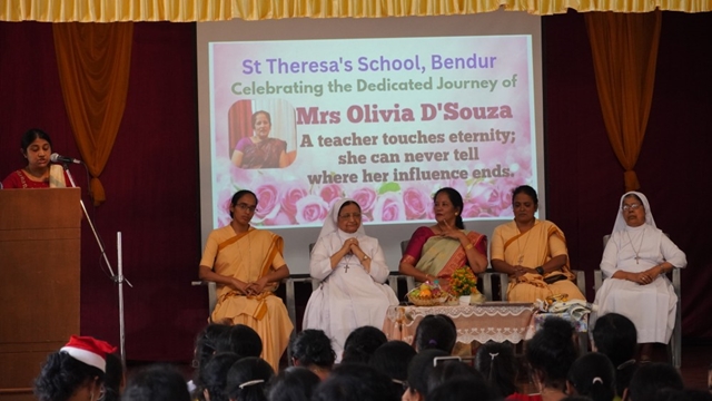 Mangaluru, Dec 23: St Theresa’s School, Bendur, witnessed a meaningful and joy-filled Christmas programme cum retirement felicitation in honour of Olivia R A Dsouza on December 23 at the school’s main hall. The programme was held in an atmosphere of gratitude, celebration, and festive cheer.