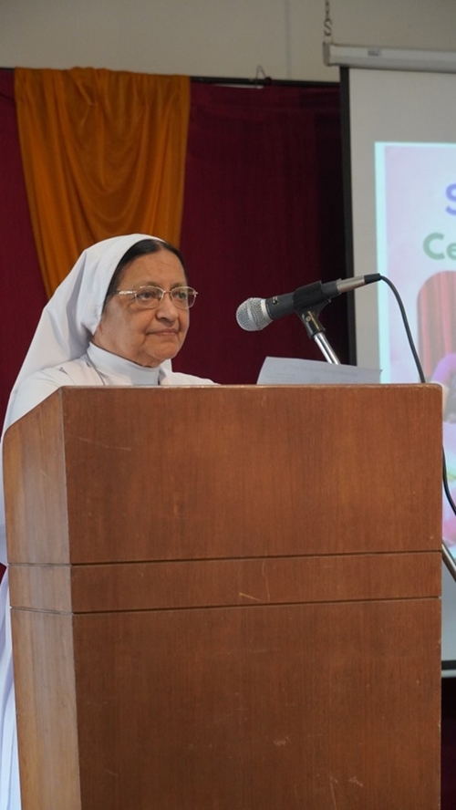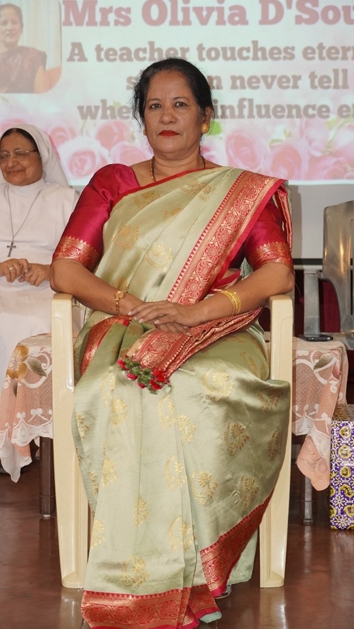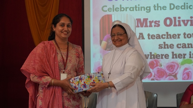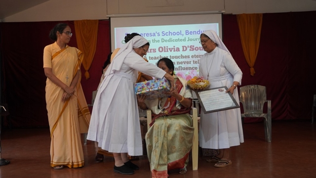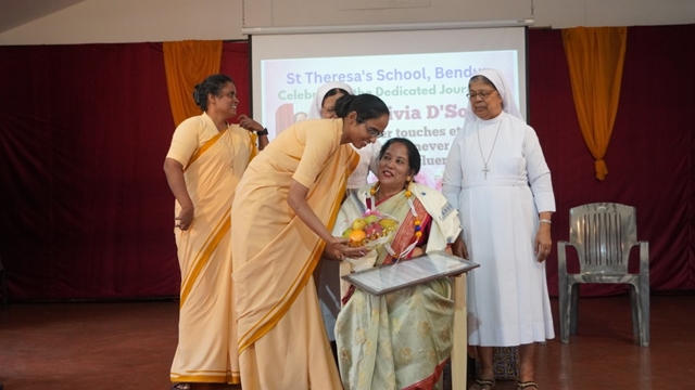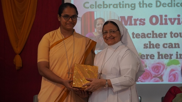 Olivia was then honoured in a special felicitation ceremony. Sr Shaila, the correspondent and chief guest, addressed the gathering on behalf of the management, appreciating Olivia’s committed service, strong values, and lasting contribution to the institution. Sr Lourdes, the principal, gave a farewell speech and also read out the citation of honour, highlighting Olivia’s journey, leadership, and impact on generations of students.