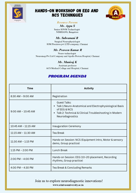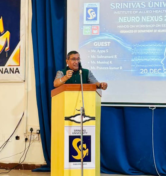 Mangaluru, Dec 25: The department of neuroscience, IAHS, Srinivas University, organized a hands-on workshop on Electroencephalography (EEG) and Nerve Conduction Studies (NCS), 'Neuro Nexus 2025' on December 20 to enhance students' practical skills and clinical competence in neurodiagnostic techniques.