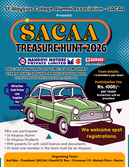 Mangaluru, Jan 2: The St Aloysius College Alumni Association (SACAA) will organise the second edition of the SACAA Treasure Hunt exclusively for its alumni and students as part of the institution’s Founder’s Day celebrations on Sunday, January 4. The event will commence at 8 am from Loyola Hall (Gate No. 10) of St Aloysius (Deemed to be University) campus.