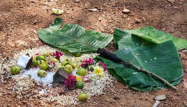 At the Katara junction connecting Darandakukku, Katara and Anadkka, several lemon pieces stained red, broken coconut pieces, large-sized kolthiri, red and yellow flowers, and bunches of banana leaves were found at the spot covered with dried leaves. These items were first noticed on Sunday by people heading to the milk dairy.