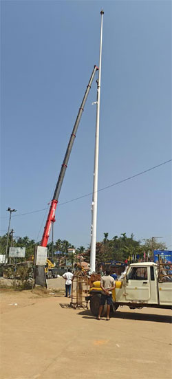 The installation of the massive 80-metre-high national flagpole began on Sunday morning. Using a large crane, the flagpole was erected, and by evening, the national tricolour was hoisted briefly on a trial basis before being lowered. MLA Ashok Kumar Rai and others were present during the installation. Hundreds of people gathered at the site and watched the proceedings with keen interest.