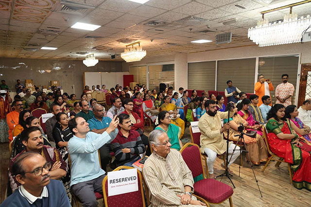 Following the inaugural ceremony, a two-hour Gamaka vachana presentation based on the narrative “Shri Krishna Sarathya” enthralled the audience. While Revathi Chidambar and Prasad Bharadwaj rendered the Gamaka with melodious precision, M C Prakash enriched the presentation with vivid, insightful, and engaging explanations, leaving the audience spellbound.