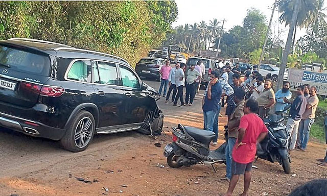 Harish, who was riding the bike, and pillion rider Rudresh sustained injuries in the mishap. Both the motorcycle and the car were damaged in the accident.