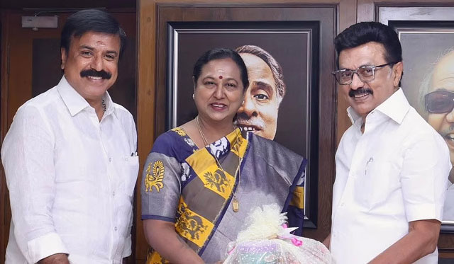 DMDK general secretary Premalatha Vijayakanth and party treasurer L.K. Sudish met Chief Minister M. K. Stalin, who is also president of the Dravida Munnetra Kazhagam (DMK), at the party headquarters, Anna Arivalayam in Chennai, formally sealing the alliance.