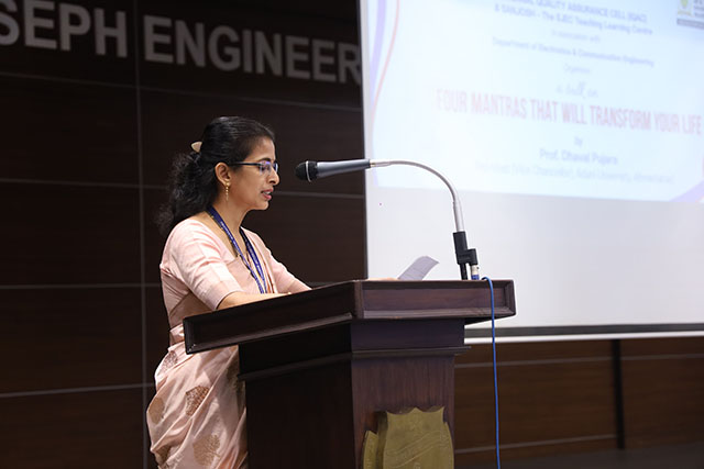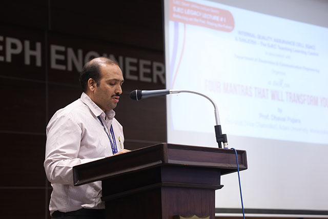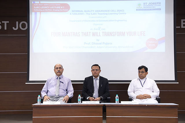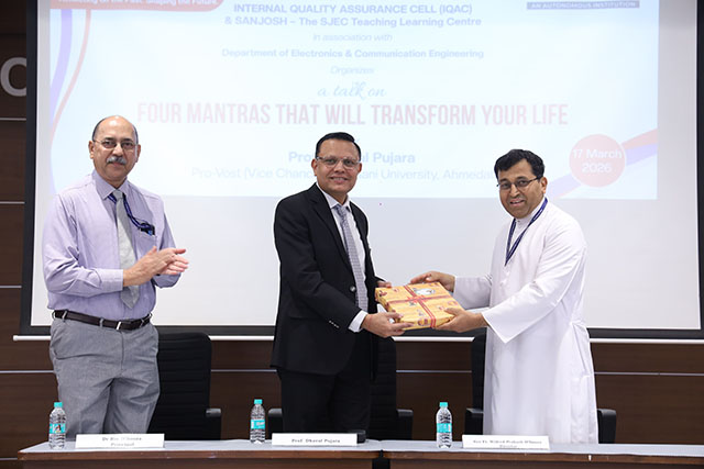 The inaugural lecture was delivered by Prof Dhaval Pujara, pro-vost (vice chancellor) of Adani University, Ahmedabad. The lecture aimed to inspire students and faculty by sharing practical life principles through the theme ‘Four Mantras That Will Transform Your Life.’ The event was organized by the Internal Quality Assurance Cell (IQAC) and SANJOSH – The SJEC Teaching Learning Centre, in association with the Department of Electronics and Communication Engineering.