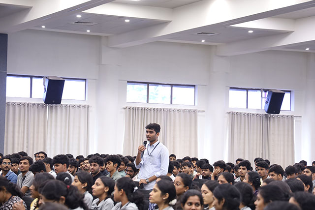 During his lecture, Prof Dhaval Pujara spoke about the concept of Creator and Creation, emphasizing that faith in a supreme power is the first lesson one must embrace in their life. He highlighted the importance of prompt engineering in the modern technological era and then elaborated on the four mantras that can transform life: positive attitude, time management, stress management, and ethics & values.