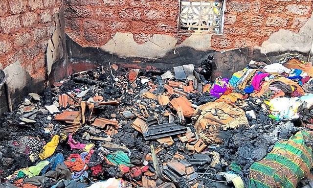The house belonging to Ganapu Shetty, a semi-stone structure, suffered extensive damage, with the roof and walls partially destroyed. Household items including gold ornaments, cash, television, electronic appliances, clothes and utensils were completely burnt in the blaze.