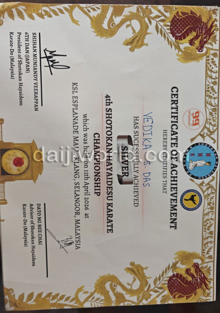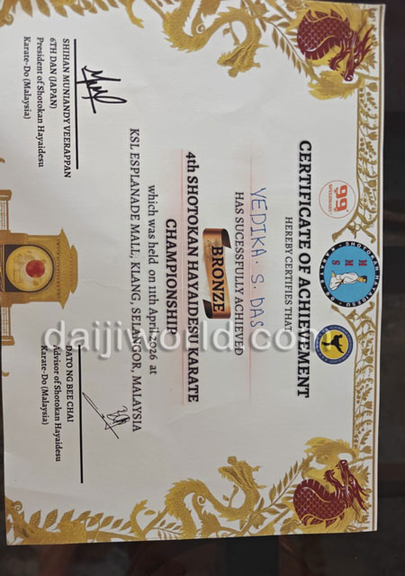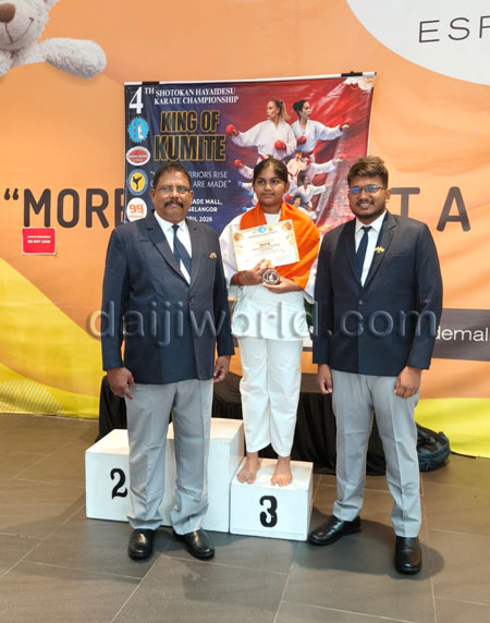 Vedhika achieved this feat at the 4th International Shotokan Hayadese Karate Championship held on April 11 in Kuala Lumpur, Malaysia. Having started karate training in 2024, it is notable that she has reached this level within just one year. With consistent practice over the past year, she has already earned a yellow belt. Representing the Western Institute of Martial Arts Academy, she trained under the guidance of Kyoshi Surendra B, Kyoshi Victor D’Souza, and Sensei Aneesh B, developing her skills.
