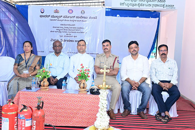The inaugural ceremony began with prayer and lighting of the traditional lamp in the presence of dignitaries, Fr Sylvester Vincent Lobo, administrator Father Muller Nursing College Thumbay, Dr Reena Wilma Frank principal, Father Muller Nursing College Thumbay, Dr George Sunil D’Souza head, chair in Christianity, Umar Faruk School Development president, Ruksana Banu panchayat president and Praveen K N Fire Station officer.