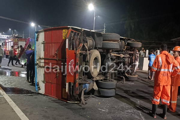 ಕಾಸರಗೋಡು: ಟಯರ್ ಸ್ಪೋಟಗೊಂಡು ರಸ್ತೆ ಮಗುಚಿ ಬಿದ್ದ ಲಾರಿ; ಚಾಲಕ ಪಾರು