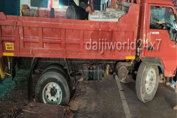 ಸ್ಥಳೀಯ ಕಟ್ಟಡದ ಆವರಣಕ್ಕೆ ಇಂಟರ್ಲಾಕ್ ಅಳವಡಿಸಲು ಲಾರಿಯಲ್ಲಿ ಇಂಟರ್ ಲಾಕ್ ಬಂದಿದ್ದು ಲಾರಿ ರಿವರ್ಸ್ ಬರುತ್ತಿದ್ದಾಗ ಹಿಂದಿನ ಚಕ್ರ ಪಕ್ಕದ ಚರಂಡಿಯ ಸ್ಲಾಬ್ ಮುರಿದು ಚರಂಡಿಗೆ ಇಳಿದಿದೆ. ಈ ಸಂದರ್ಭದಲ್ಲಿ ಲಾರಿ ಹಿಂದೆ ಅಥವಾ ಮುಂದೆ ಚಲಿಸಲು ಸಾಧ್ಯವಾಗಲಿಲ್ಲ.