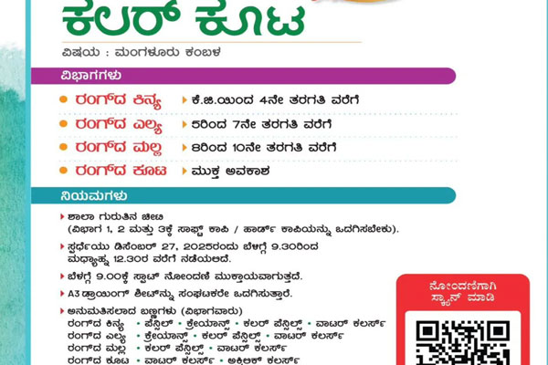 ಸ್ಪರ್ಧೆಗಳು ಮತ್ತು ಹೊಸ ಪ್ರಯೋಗಗಳು : ‘ರಂಗ್ದ ಕೂಟ’ ಹೆಸರಿನಲ್ಲಿ ಚಿತ್ರಕಲಾ ಸ್ಪರ್ಧೆ ರಂಗ್ದ ಕಿನ್ಯ, ರಂಗ್ದ ಎಲ್ಯ, ರಂಗ್ದ ಮಲ್ಲ ಮತ್ತು ರಂಗ್ದ ಕೂಟ ವಿಭಾಗಗಳಲ್ಲಿ ಬೆಳಗ್ಗೆ 9.30ರಿಂದ ಮಧ್ಯಾಹ್ನ 12.30ರವರೆಗೆ ನಡೆಯಲಿದೆ.